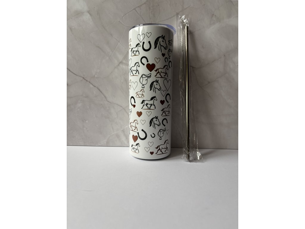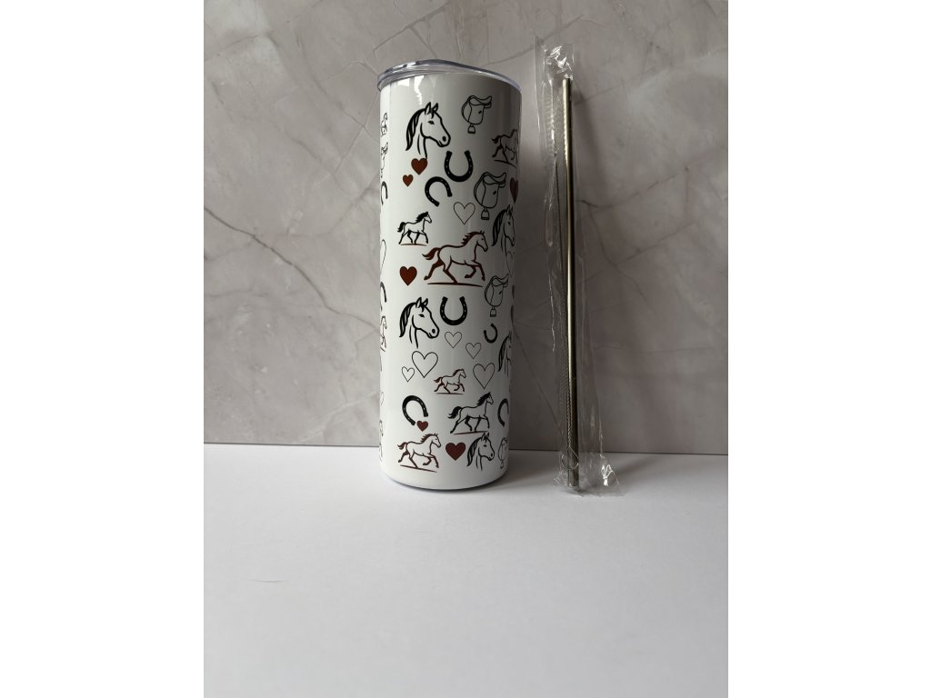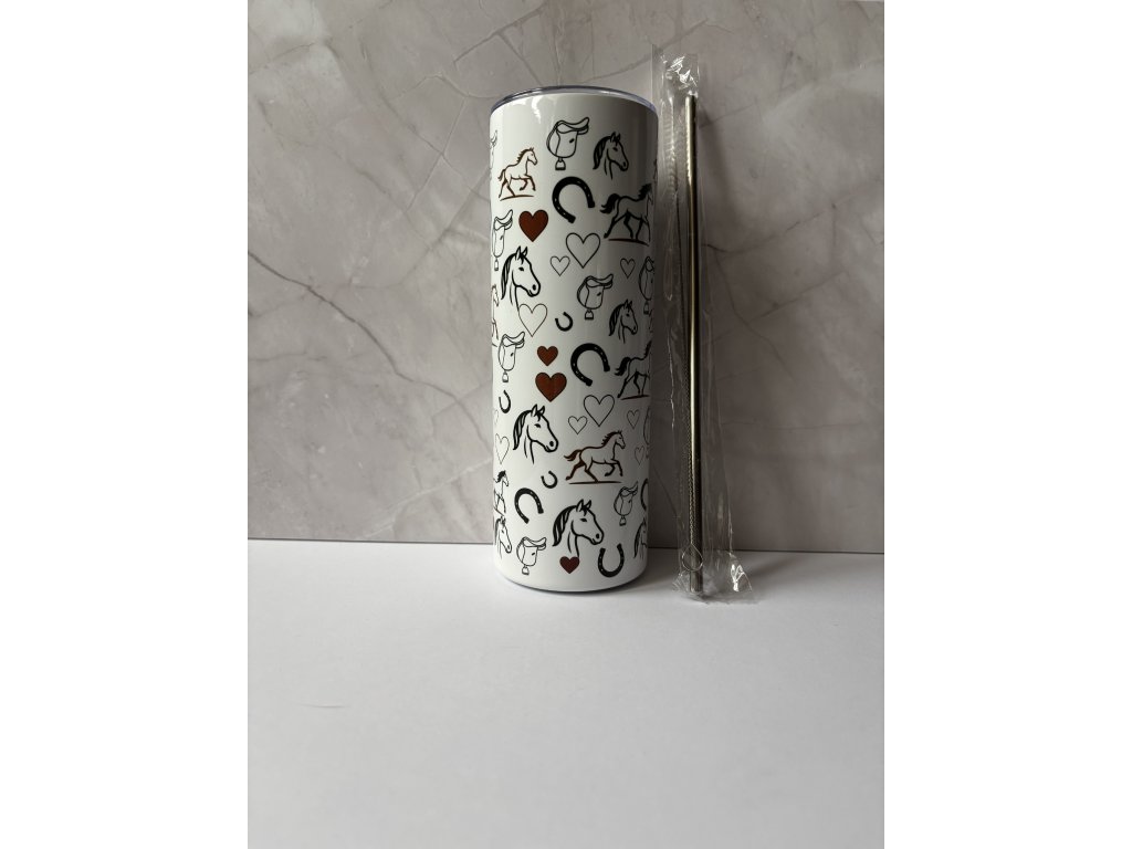 Stylový termohrnek s motivem inspirovaným světem koní – najdeš na něm siluety koní, podkovy, sedla i další jezdecké prvky. Ideální společník pro všechny, kteří milují vůni stáje a vítr ve vlasech. 💫