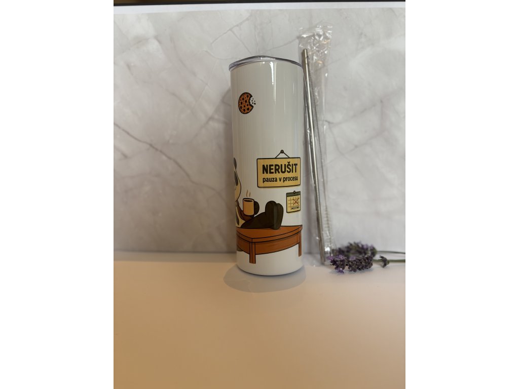 Stylový termo kelímek s pandou, která si dává pauzu u sušenky a kávy. Dvojitá izolační vrstva udrží nápoj teplý až 8 h a studený až 12 h.